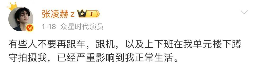 1月18日,张凌赫在微博写道:“有些人不要再跟车,跟机,以及上下班在我单元楼下蹲守拍摄我,已经严重影响到我正常生活。”