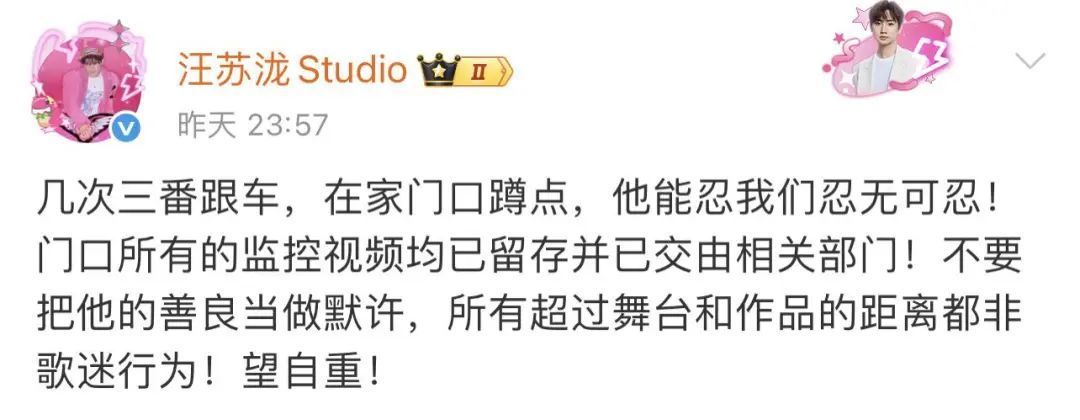 汪苏泷工作室写道:“几次三番跟车,在家门口蹲点,他能忍我们忍无可忍!门口所有的监控视频均已留存并已交由相关部门!不要把他的善良当作默许,所有超过舞台和作品的距离都非歌迷行为!望自重!”