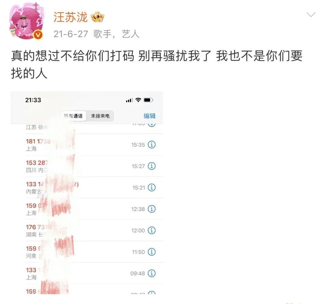 据了解,这并非汪苏泷首次受到“私生”行为的困扰。2021年,汪苏泷曾发布一张手机通话记录截图,显示从凌晨至下午接到了十多个陌生电话。他表示:“真的想过不给你们打码,别再骚扰我了,我也不是你们要找的人。”