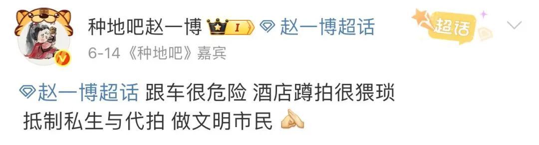 6月14日,赵一博发文表示:“跟车很危险,酒店蹲拍很猥琐。抵制私生与代拍,做文明市民。”